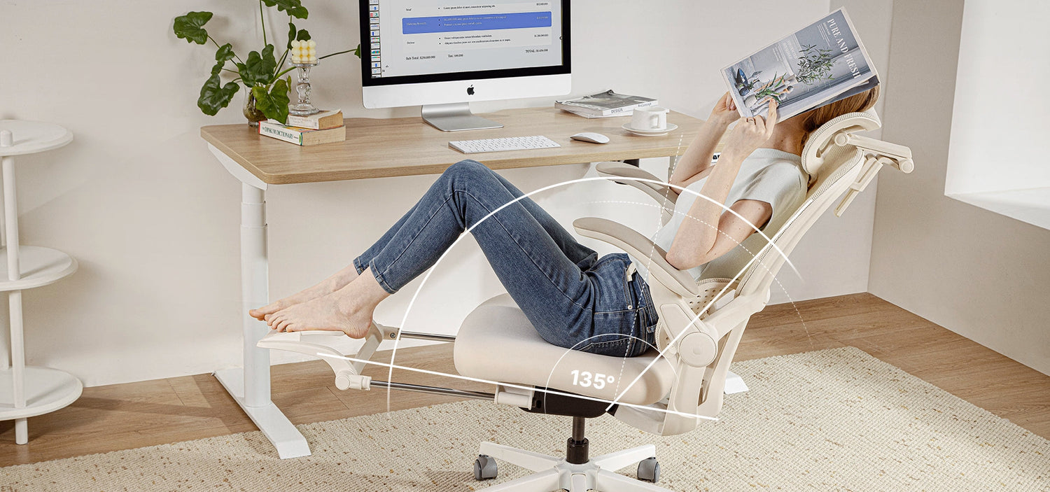 Stretch out, stress away. Max 135° recline with built-in leg rest creates your personal chill zone. Almost horizontal positioning gives your body the reset it deserves.