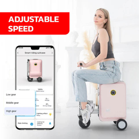 The Airwheel Smart Rideable Suitcase lets you set a lower maximum speed if needed, with adjustable settings through the mobile app. Choose from low, medium, or high speed levels for a personalised and safe ride.