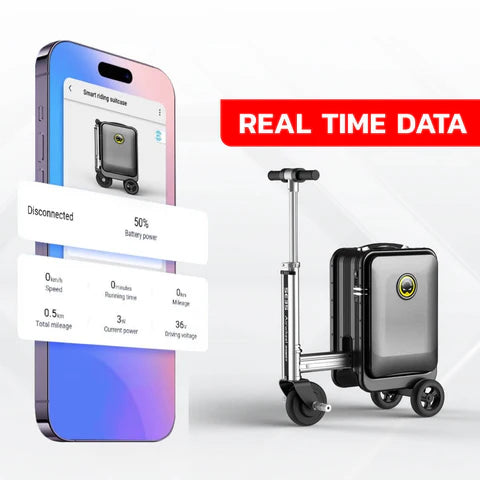 The Airwheel Smart Rideable Suitcase mobile app offers detailed insights, such as battery level, current speed, and total distance travelled. Stay in control with real-time data for an enhanced travel experience.