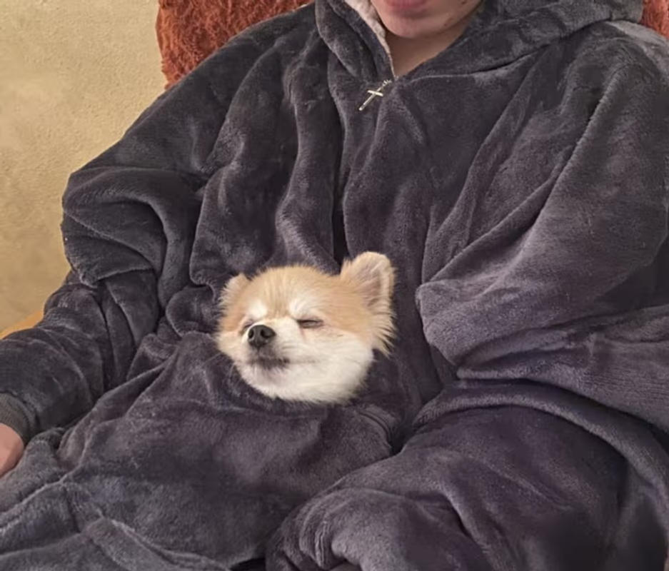 This is sooo comfy and soft. I have used cozy blankets like this, but in the winter, this just does it better! The sherpa, or as I call it, coosh, keeps you warm, and the cuffs on the sleeves keep the cold air from sneaking in and making you cold again. The pocket, pictured with a small dog, can work for many things, like a tablet, cuz my dogs are way too big. LOL I just love it!